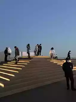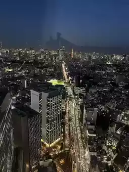 As time passed, the color of the sky began to change. The setting sun dyed the sky a warm orange, reflecting off the city lights that started to glow. On the distant horizon, the clear silhouette of Mount Fuji appeared faintly in the evening glow. Many visitors, like me, quietly admired this rare and peaceful beauty.