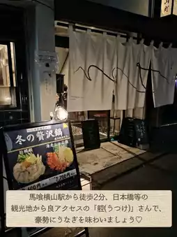Enjoy a sumptuous meal of eel at "Utsuke," located just a two-minute walk from Bakuroyokoyama Station and easily accessible from tourist spots like Nihonbashi. ♡