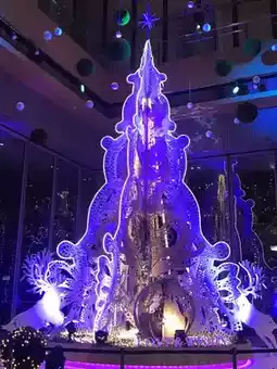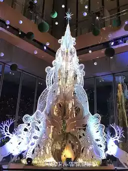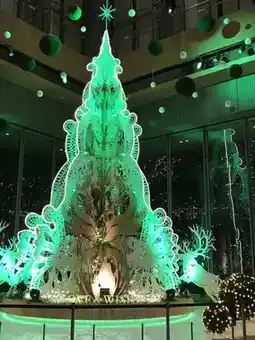 • Approximately 10m tall, this Christmas tree expresses gratitude to the earth, its flora and fauna. It features paper-cut squirrels and reindeer. The materials used will be recycled as environmental resources.