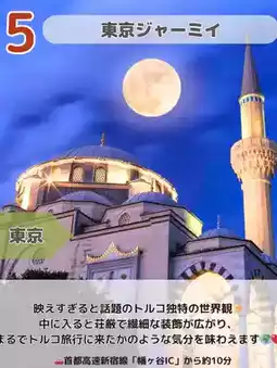 ⑤🕌 Tokyo Camii • Address: 1-19 Oyama-cho, Shibuya-ku, Tokyo • Access: ◦ Car: Approximately 10 minutes from Hatagaya IC on the Metropolitan Expressway Route 4 Shinjuku Line ◦ Train/Bus: Approximately 5 minutes on foot from Yoyogi-Uehara Station on the Odakyu Line or Tokyo Metro • Fee: Free ✨ One of Japan's largest Islamic mosques. Experience the exotic atmosphere amid the beautiful décor and tranquil space.