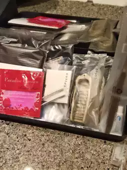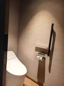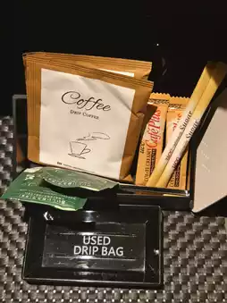 The room was stocked with toiletries, including shampoo, conditioner, shower gel, toothbrush, toothpaste, cotton pads, and cotton swabs. There were also tea bags, coffee, disposable slippers, a yukata, bottled water, a digital scale, and a safe. Two beautiful postcards were also included. ———