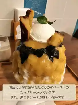 A 3-minute walk from Tsukishima Station, you can enjoy fluffy shaved ice made with natural ice from Mt. Fuji and honey-sweet roasted sweet potatoes!