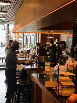The restaurant has a hipster feel with a simple, wood-like design and good lighting. The window seats have large floor-to-ceiling windows overlooking Nishi-Sandō, creating a quiet and relaxing atmosphere. It's a great place to relax, browse your phone, or organize photos. The space isn't large, but it's not too crowded.