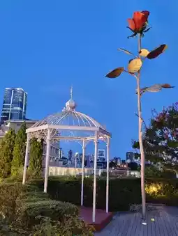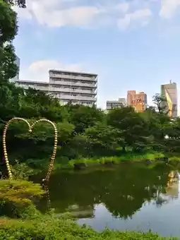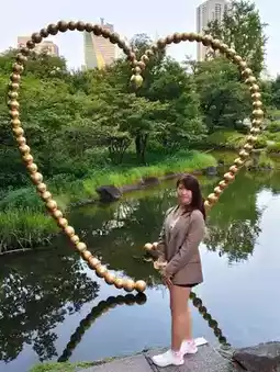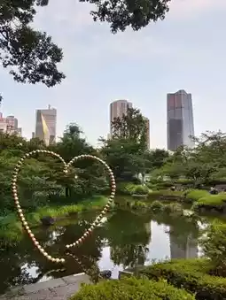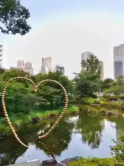 The panoramic view of the Mori Garden is truly romantic. A small lake framed by a dazzling golden heart, along with the grass, trees, and modern buildings, is breathtakingly beautiful. 🥹🩷