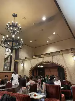 The open, atrium-style space, red chairs, and stately interior truly exude the aura of a "meikyoku cafe."