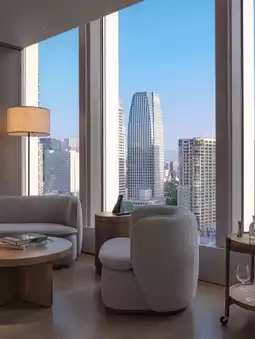 A space offering panoramic views of Tokyo's cityscape, where guests can enjoy light meals and drinks in a serene and luxurious setting.