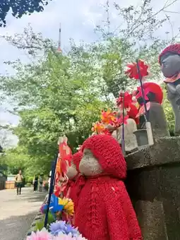 At Zojoji Temple, it's easy to snap a photo with Tokyo Tower. It's also a popular temple for broadcasting the bell-ringing ceremony after the New Year's Red and White Festival in Japan. To the right of the temple, there's a row of adorable baby Jizo statues—Chibako Jizo. These stone statues embody the parents' hope for their children's healthy growth, and parents often dress them in clothes, hats, and even place pinwheels.
