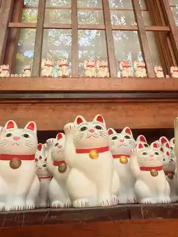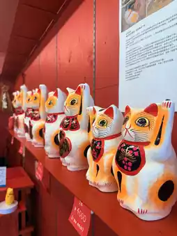 The most spectacular feature of Gotoku-ji Temple is the Maneki Nekoden, which is filled with thousands of maneki Neko. Worshipers can buy a maneki Neko and, once their wishes are fulfilled, return it to the temple for worship. The temple's ema (drawn horses) and fortune-telling verses also feature maneki Neko.
