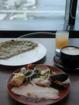 The breakfast, which I was looking forward to, was also luxurious and very satisfying.🤤 I chose pizza as my main course, and the chewy crust was absolutely delicious. I highly recommend it.🍕 The buffet, especially the roast pork, was so good I ate a lot!