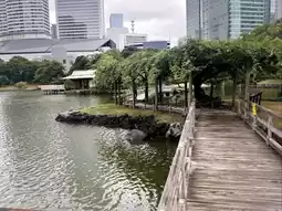 The traditionally styled garden stands in stark contrast to the skyscrapers of the adjacent Shiodome district.