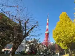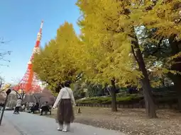 π As the sun sets, the golden leaves take on a deeper glow under the twilight, and Tokyo Tower lights up with warm yellow lights. This stunning scene is truly breathtaking!