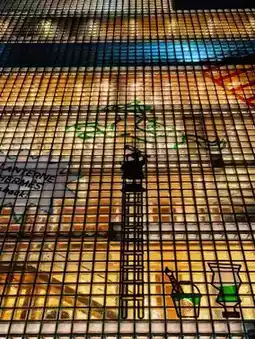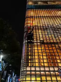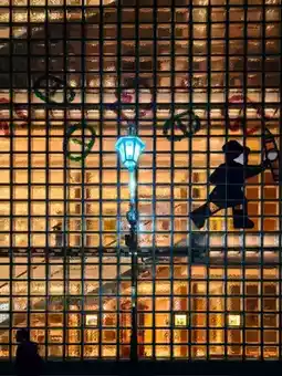 The first to catch the eye is the Hermès building. Made of countless glass bricks, it emits a warm, soft golden glow at night, like a giant exquisite lantern. The playful silhouette of a “craftsman” on the wall seems to quietly tell the brand’s century-old dedication to craftsmanship.