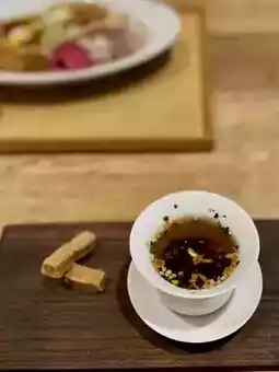 For lunch, I enjoyed a seasonal autumn kamameshi (rice pot) and a cup of herbal tea infused with cinnamon bark and loquat leaves β soothing, aromatic, and deeply comforting. The flavors felt like a gentle embrace of autumn itself.