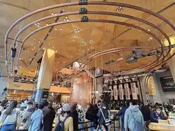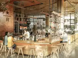 Entering the store, the most striking feature is the 17-meter-tall "Copper Bean Roasting Tower" in the center. This tower, symbolizing the soul of coffee, is engraved with over 2,100 handcrafted copper sheets, which gleam softly under the light. The aroma of roasted coffee beans fills the space, evoking a sense of immersion in the art of coffee. Customers can witness the entire coffee bean production process, from green beans to roasting, grinding, and brewing. This "transparent process experience" is the core concept of Starbucks Reserve.