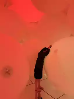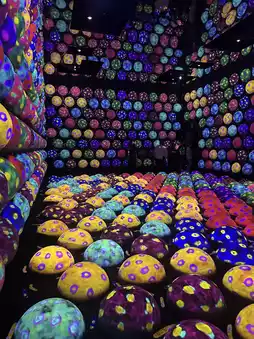 • The work of the artist-technology collective teamLab emphasizes the "walk into the art" experience, which includes walking barefoot through shallow water, a reflective glass floor, hanging flower gardens, and a room of thousands of LED lights.