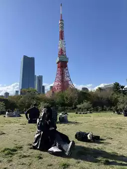 • From Shiba Park, you can see the tower fully, with Zojoji Temple in the background.