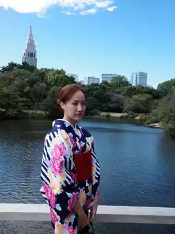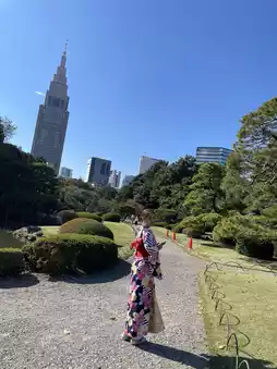 Today, we rented a kimono from a shop near Shinjuku Station 🎎 and took our sweetheart for a photo walk in the garden. Let me tell you, the atmosphere was so soothing! ☀️ The pastel-colored kimono contrasted against the backdrop of the large green trees and crystal-clear pond was so beautiful that we couldn't stop taking photos. 💕