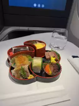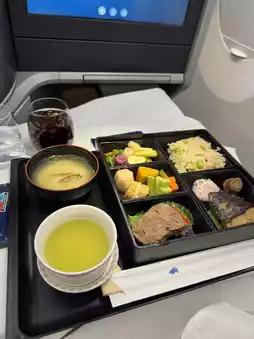 One of the highlights was the in-flight meal 🍱. This time, I opted for Japanese cuisine. From the beautifully presented appetizers to the main dishes of simmered vegetables, grilled fish, and braised beef, every bite was authentic and flavorful, defying the expectations of airplane food. The meal included edamame rice, miso soup, and green tea, delivering satisfaction akin to dining at a high-end restaurant. The dessert, a refreshing citrus sorbet, was the perfect finale, leaving me thoroughly impressed 🍊✨