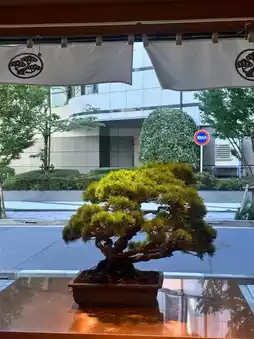 • The interior is decorated with wood. Natural materials and a 200-year-old bonsai tree are used as decorative elements, creating a sense of calm in the midst of a bustling city.