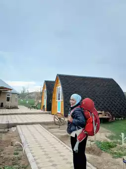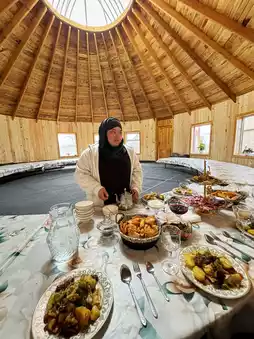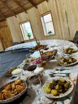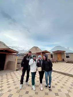 Our yurt is near Issyk-Kul Lake, so we have a view of the lake from our yurt, and the owner cooks for us delicious food during our stay.