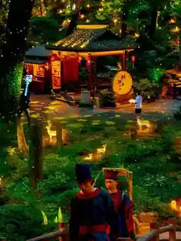 🍜 The Jiangnan Flavor Snack Street is bustling at night. There are all kinds of snacks, such as rice cakes, pork soup, and cold noodles. You can enjoy delicious food while watching exciting performances or have a bonfire party with friends. It's a wonderful night.
