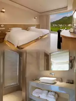 The rooms are mainly decorated in white and wood tones, complemented by furniture with distinct Chinese characteristics. They are also equipped with central air conditioning, underfloor heating, high-end bathroom fixtures, and imported toiletries. My favorite feature is the small balcony outside the room. It's the perfect place to relax with a pot of tea, listening to the rustling leaves and the murmuring stream below.