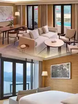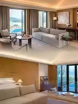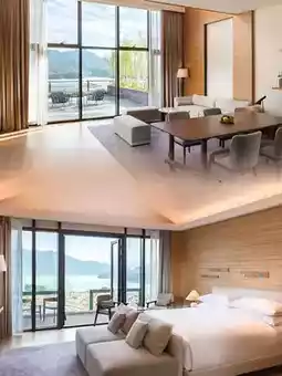 The hotel is backed by green mountains and is truly super luxurious. It has a total of 79 rooms, most of which are luxury suites. The spacious rooms are up to 73 square meters in size, and the smallest villa is 83 square meters in size. Each room has a lake view and a large balcony. With a 270° panoramic view of the lake and mountains, it feels very comfortable just sitting here. If you are lucky, you can also encounter a beautiful sunset. The guest rooms are all luxuriously and high-quality, with fully automatic curtains, capsule coffee machines, TWG tea bags and coffee, Bose Bluetooth speakers, automatic toilets, Shanghai Tang toiletries, and free mini-bars for check-in on the same day!