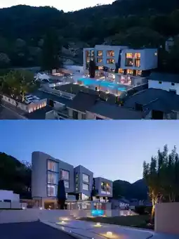 Ascend the steps to discover a crystal-clear infinity pool seamlessly blending with courtyard water features, creating picturesque transitions that naturally guide guests to the lobby.