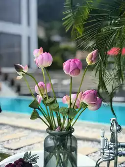 Dive into the crystal-clear pool 💦, recline on a rattan chair,