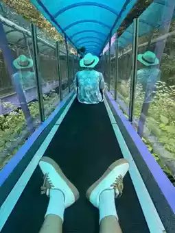 3️⃣ Cloud Ladder Sky Bridge: A super long purple sky bridge with two paths; the brave take the right side, where there’s a glass suspension walkway beneath your feet.
