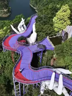 2️⃣ Purple Hand: Giant purple Buddha hands support a suspended wooden boardwalk, reminiscent of a mysterious fairytale scene, creating a truly captivating photo opportunity.