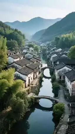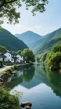 - ✅ Fuchun River runs through the entire area: clear blue water, green mountains on both sides like ink wash, boats drifting like poetry