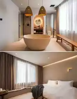 The design of Liang Mu Ban Villa really touches my heart! Inspired by "reversing childhood," it captures those warm and beautiful moments in this space. It retains the original charm of the old house, paired with wooden furniture, handmade pottery, and warm-toned soft furnishings. The courtyard is carefully designed with a thatched house relaxation area, starry river swimming pool, bamboo forest private hot spring pool, coffee house, bonfire camping area, and kiln pizza area, each full of natural wild charm and thoughtful design.