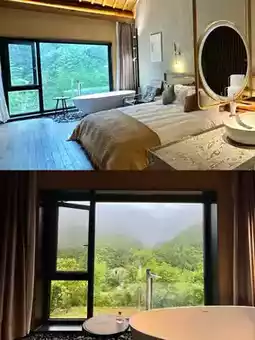 Rooms are super spacious🪟, floor-to-ceiling windows frame the entire mountain view indoors, opening the door immerses you in greenery🍃, total relaxation! Comes with a private courtyard terrace, spotless cleaning, window-side bathtub with TV🛁, enjoy the view while soaking; bathroom with dry-wet separation🚿, smart toilet is very thoughtful~ Bedding is soft and comfy, fall asleep instantly💤, a worry-free good night's sleep!