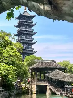 Climb the Bailian Pagoda for panoramic views of the Jiangnan water town scenery. Behind the pagoda lies the Grand Canal of Beijing-Hangzhou. The view is even more enchanting at night when the lights are illuminated. At the base of the pagoda is the Ruyi Bridge.