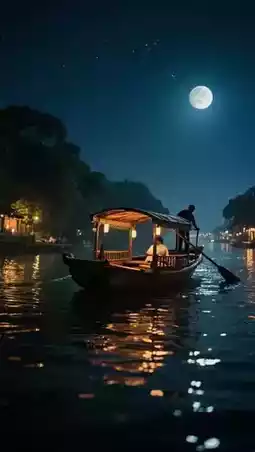 - Lanterns reflecting on water at night, strolling on stone paths in Hanfu