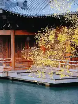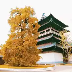 Sunlight filters through the golden leaves, casting dappled light on the blue-gray eaves and vermilion courtyard walls. When the wind blows, golden leaves flutter down like gold foil, and the air is filled with a warm autumn atmosphere.
