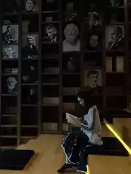 3. Staircase Library: Bookshelves filled with literature related to "Literary Memoirs." Sitting here overlooking the backyard is super cozy, perfect for daydreaming and recharging.