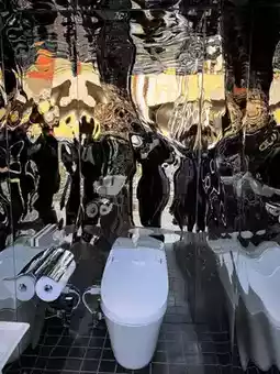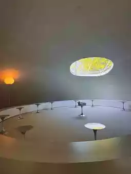 The teardrop-shaped concrete structure of the building is filled with natural light streaming in through holes in the ceiling and droplets of water gushing from the floor. 💧