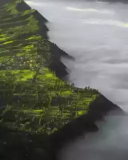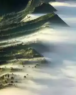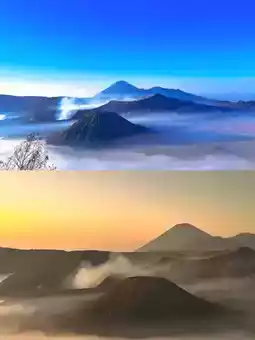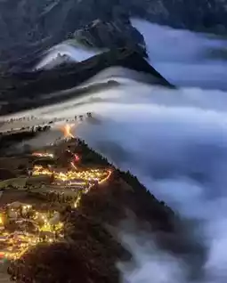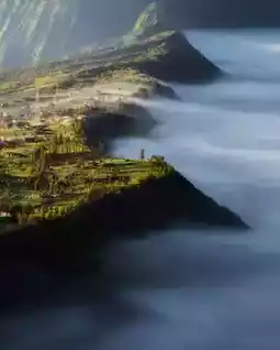 🌅 In the early morning, as you watch the sunrise over Bromo, a sea of mist slowly drifts over the cliff highlands and spreads across the village, creating a dreamy and surreal atmosphere that's perfect for stunning photography 📸.