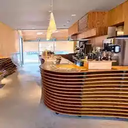 The cafe has three floors, with an ordering area on the first floor, indoor seats on the second floor, and outdoor seats on the third floor. You can overlook the sand dunes. The interior space is spacious and comfortable. Although there are many people, it is relatively quiet compared to the shopping street next to it, making it a great place to order a cup of coffee and take a break.