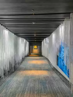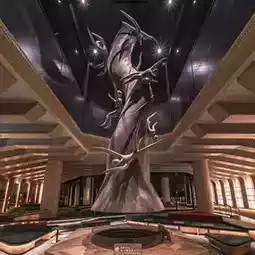 The impressive lobby, featuring a huge fireplace by Taro Okamoto,