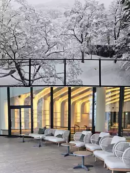 There is also a free drink space in front of the terrace, where many guests are relaxing with a hot drink in hand while looking at the snowy scenery.