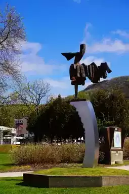 The park's sculptures took on new life beneath the cherry blossoms. Those modern, hard-edged metal and stone works seemed wrapped in soft petals. One abstract giant-faced statue wore a cluster of blossoms atop its head—from a distance, resembling a Greek deity crowned with flowers. Another bronze human figure had branches threading through it, petals adorning its form as if the metal itself had bloomed, radiating unexpected tenderness.