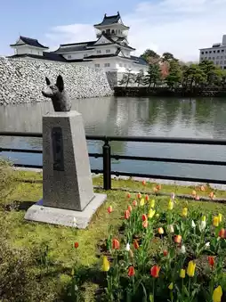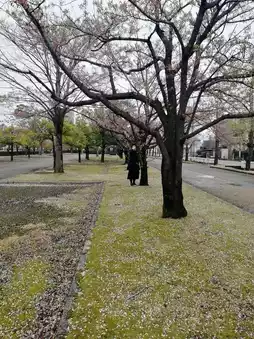 The cherry blossom trees along the Toyama River bank are quite large, but unfortunately, I arrived a few days late. Upon entering the courtyard gate, the first thing I encountered was a reed pond nestled in a grassy slope. Seven or eight ducks had quietly made their home in the lake. As you approach slowly, they begin to question your motives, first turning their heads to glance at you. If you continue to approach, they start to panic, taking a couple of steps towards the water's edge, then jumping in and swimming towards the reeds, leaving you with only their backs. However, they don't actually swim deep into the reeds to hide, but rather swim a short distance, stop, and look back at you, observing your reaction. After all, they aren't really afraid of people.