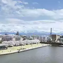 Who would have thought you could see such a beautiful contrast between the Tateyama mountain range and the cherry blossoms from the center of the city!