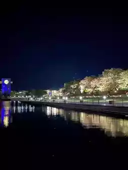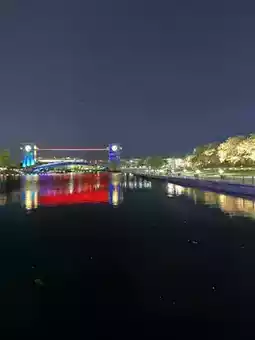 The illuminated Tenmon Bridge, with its reflections on the water, creates a fantastical photogenic scene.