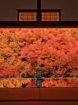 The interior lighting and pillars reflected in the window glass overlap with the autumn leaves, creating an even more fantastical view. 🖼️