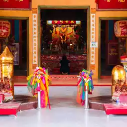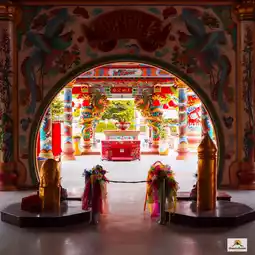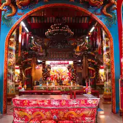 🎋🧨🙏Inside the shrine in the center is a platform where the City Pillar Shrine of Sia Ueng Kong is enshrined, along with two other deities: the left is the God of Fortune, Cai Xing Yea, and the right is the God of Earth, Kam Thiang Dai Ti. The outer part of the City Pillar Shrine is where the two main city pillars are enshrined. The tall pillar is the city pillar and the low pillar is the Shiva lingam pillar.