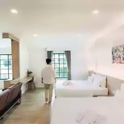 Suitable for coming to relax and recharge your body. There are many types of rooms to choose from. The rooms are spacious, decorated in a simple, comfortable style. There are complete facilities. There is also a large communal swimming pool and a cafe for us to sit and relax, take pictures and check in.